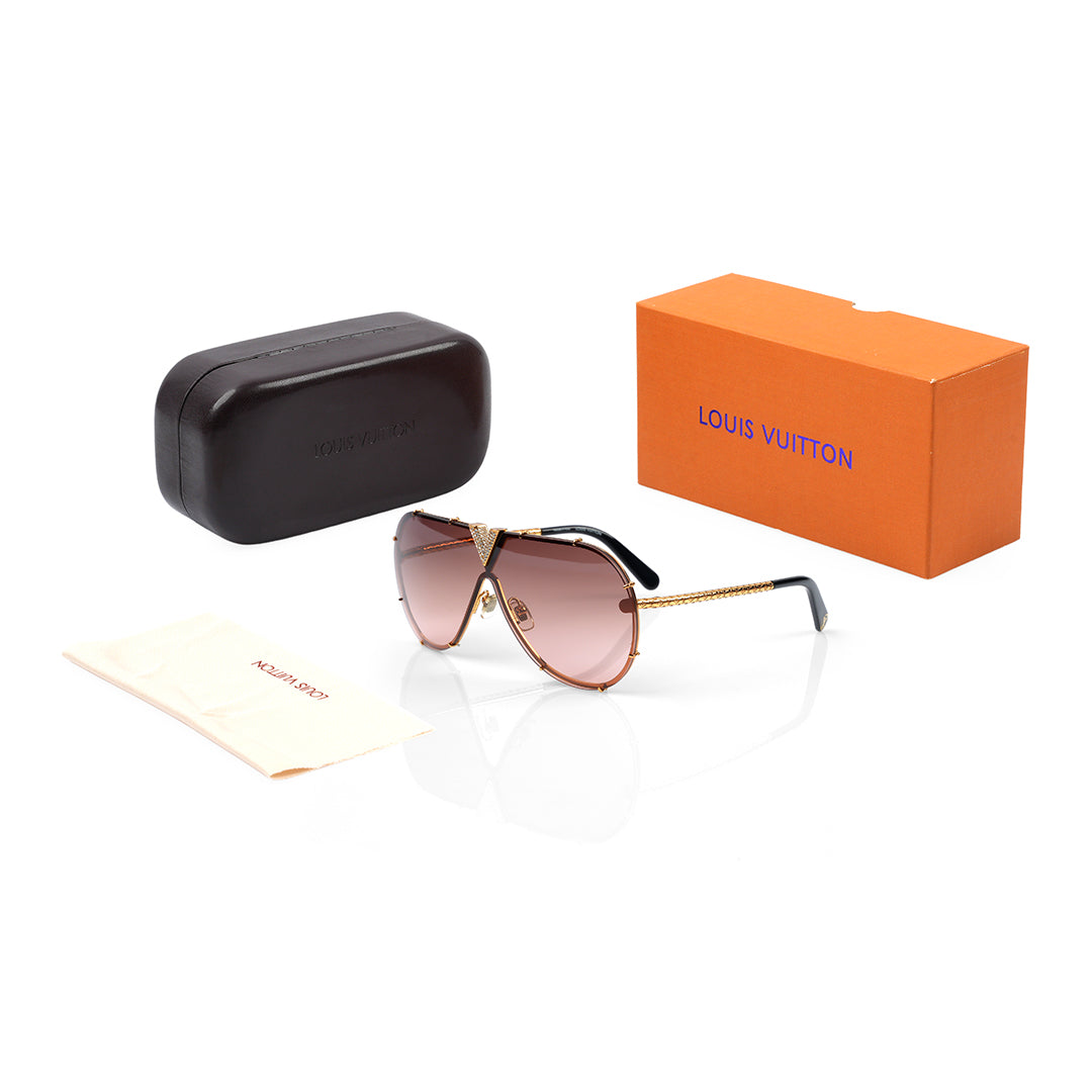 Imported Brown Gradient Shield Lens with Crystal V-Signature Sunglasses is the oversized, crystal-encrusted "V" signature at the bridge, which serves as a brilliant focal point and a nod to the Maison’s iconic heritage. Finished with delicate gold-toned stud detailing around the lens perimeter, these frames offer a luxurious, jewel-like aesthetic that elevates any ensemble.